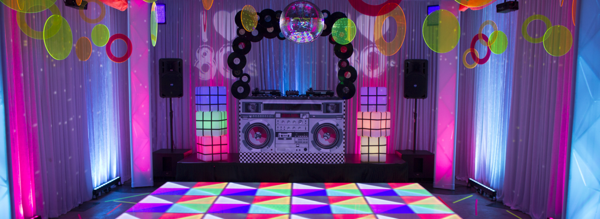 Set the scene with themed 1980s backdrops, Fluro coloured drapes, 80s style lighting options and colourful glowing furniture. Complete your retro setup with a glowing light up dancefloor and sparkling disco balls.