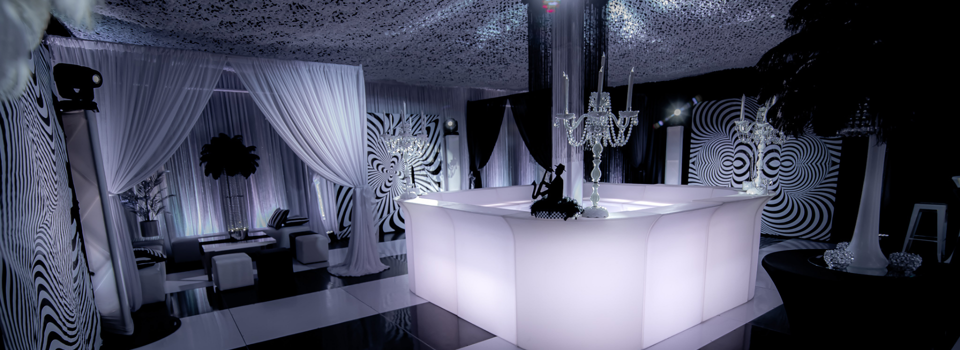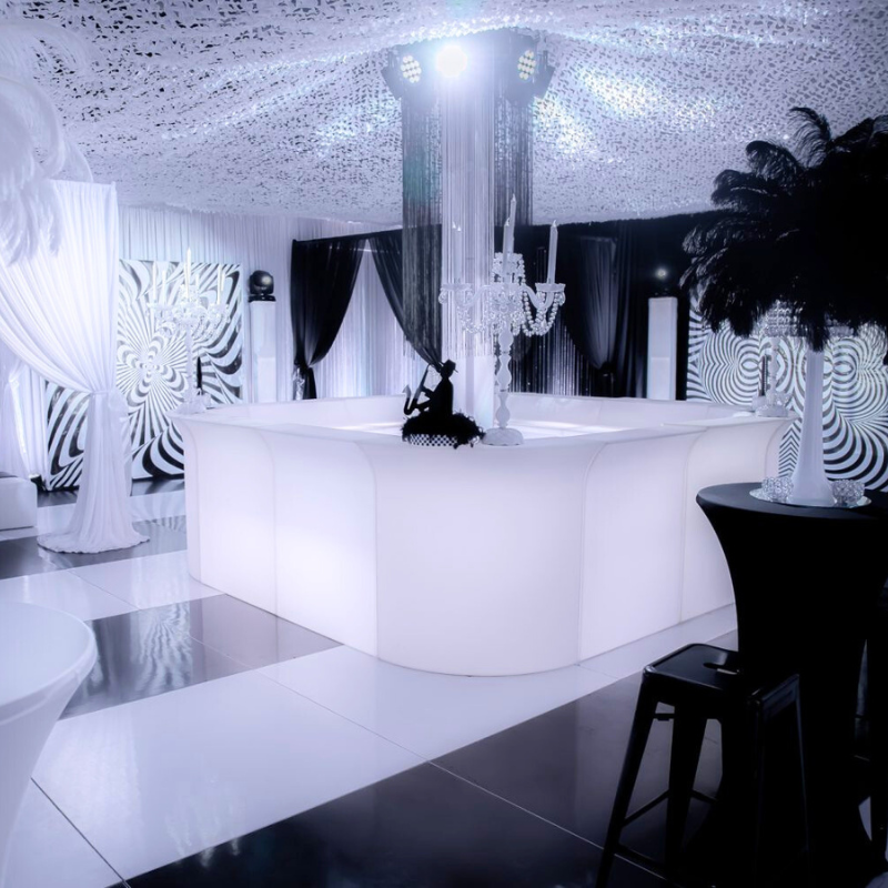 Create a stunning event backdrop with flowing chiffon drapes and bold themed backdrops, then elevate the space with elegant feather centerpieces, black and white décor, and statement props. The beauty of this theme lies in its versatility, allowing you to customise the mood and ambiance to match your unique vision.