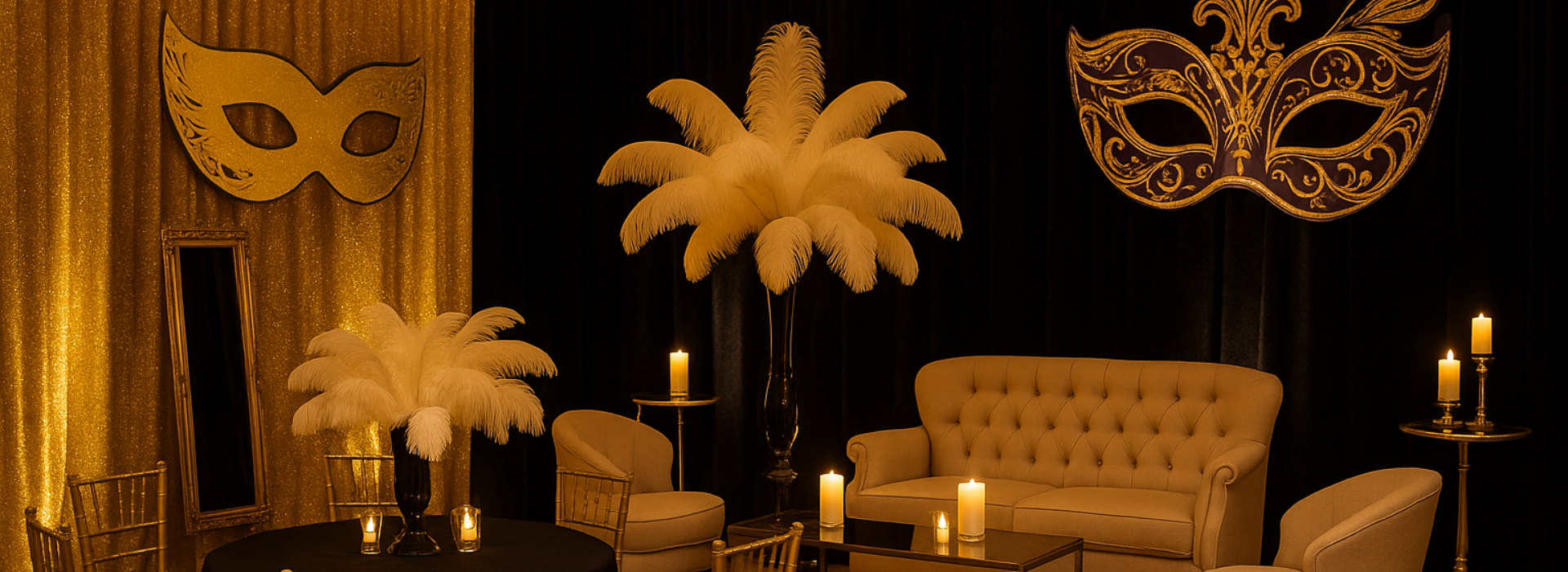 Planning a masquerade ball or themed event? Our masquerade party decoration hire brings drama, elegance, and rich detail to your event space. Think velvet and gold sequin drapes, shimmering crystal beaded curtains, and glowing crystal candelabras and chandeliers that set the mood from the moment guests arrive. Create a grand entrance with red carpets and bollards, and add flair with large masquerade mask props, ornate gold mirrors, and lush floral arrangements. For table styling, our feather and pearl centrepieces are the perfect fit.