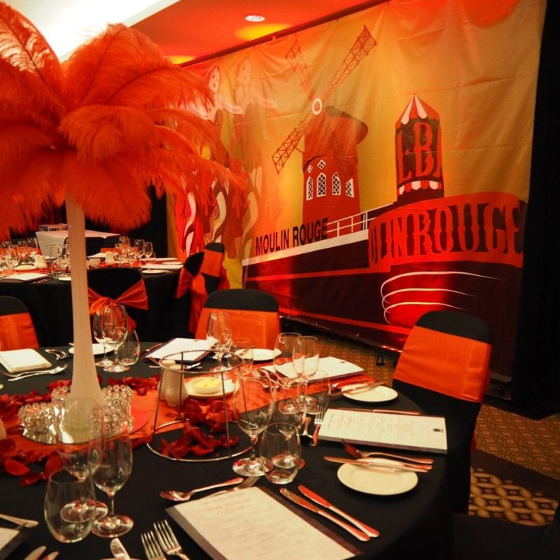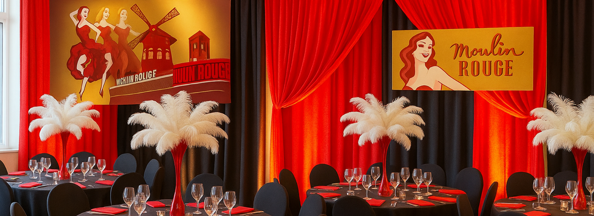 For a night of drama, glamour, and Parisian flair, our Moulin Rouge party decoration hire delivers everything you need to create a bold and seductive event space. Surround your guests with luxurious red velvet drapes, theatrical Moulin Rouge backdrops, and striking feather centrepieces that make a statement. Set the mood with glowing pillar candles, tealight candles, crystal scatters, and layered red mood lighting, enhanced by festoon lighting for extra depth.