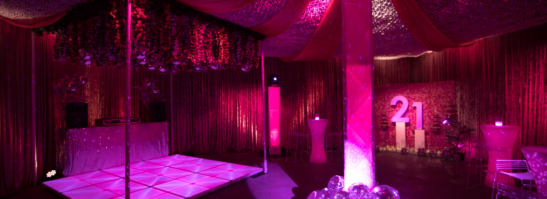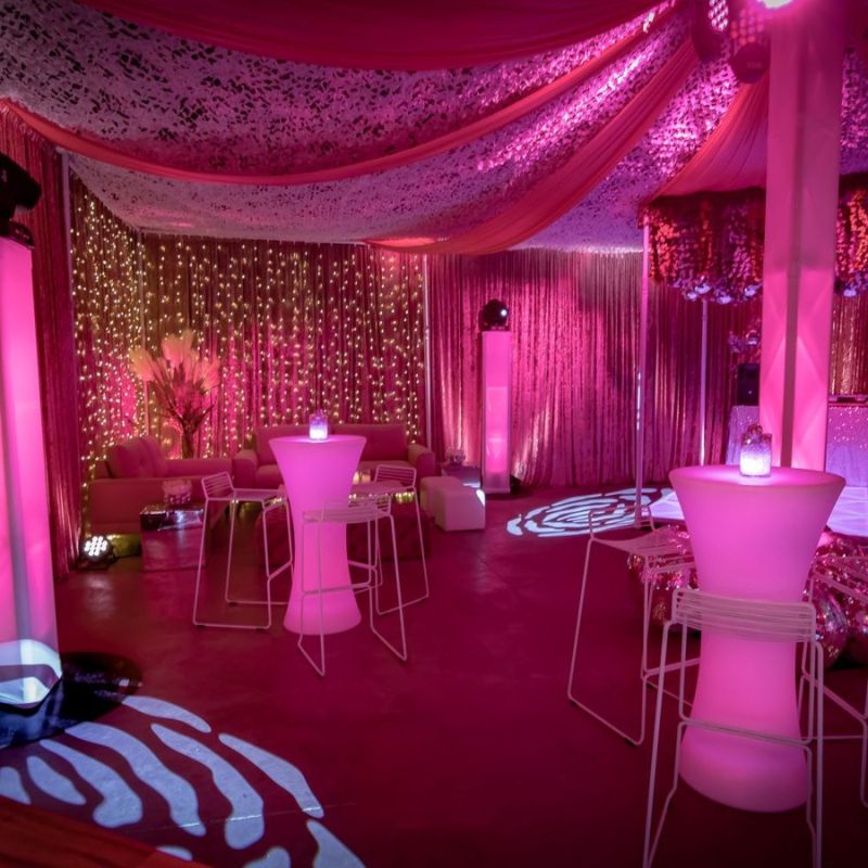 Go all-in on pink with our pink party decoration hire, designed to help you create a bold, stylish, and colour filled event. Whether it’s a birthday, hens night, or kids party, our pink party theme props include everything from soft pink floral decorations and pink coloured drapes to dramatic pink sequin photo backdrops. Style your tables with pink floral centrepieces and hanging decorations, light the space with pink party lighting and mood lighting, and add some wow factor with illuminated furniture in pink. Want to go big? Choose a pink acrylic or illuminated dancefloor, feature props like a pink bath, pink palm trees, or complete the look with pink bars and glowing neon signs.