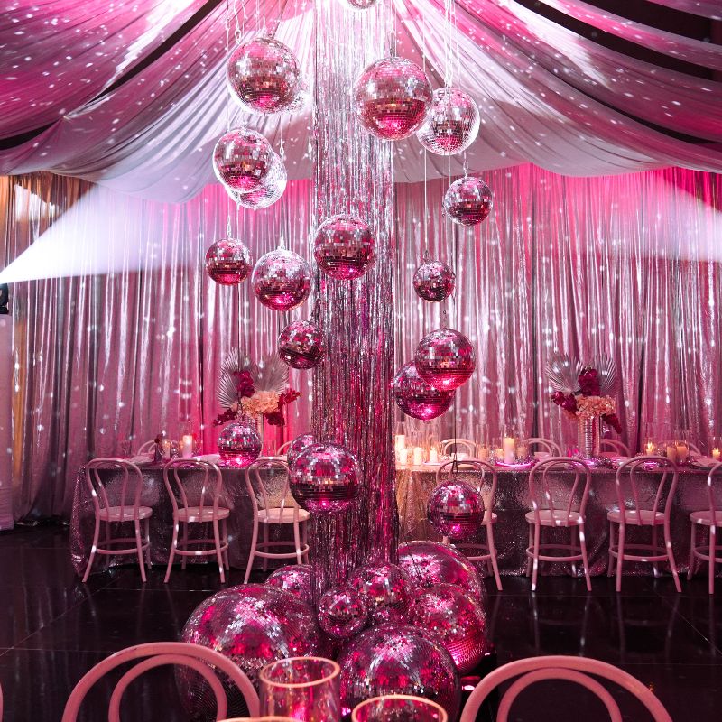 Make a statement with a pink acrylic or pink illuminated dancefloor, glowing pink bars, and bright neon signs. For the ultimate disco feel, don’t miss the mirror ball trees and classic mirror balls, all available for hire to help you create a party that feels fresh, fun, and full of energy.