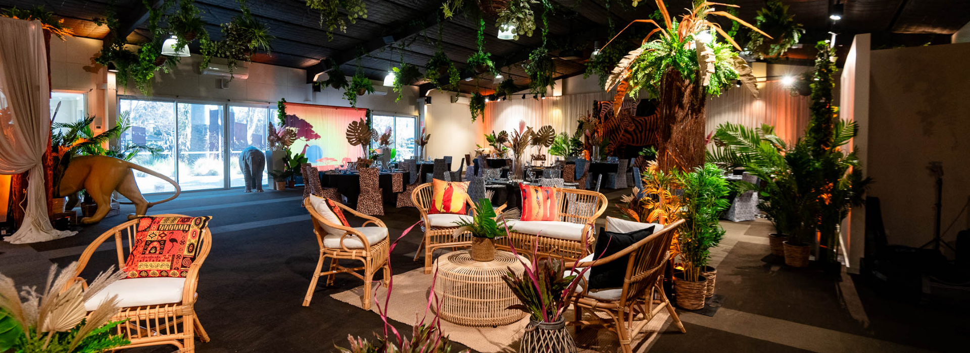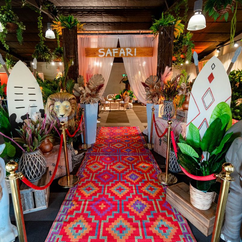 Bring the wild to your next event with our safari party decoration hire, designed to create an immersive, adventure filled atmosphere for birthdays and corporate themed event. Our collection of safari theme props includes impressive large safari animal props, African shields, and safari and animal themed backdrops to help you set the scene. Add texture and colour with artificial plants, earth-toned mood lighting, and safari-styled centrepieces and floral decorations.