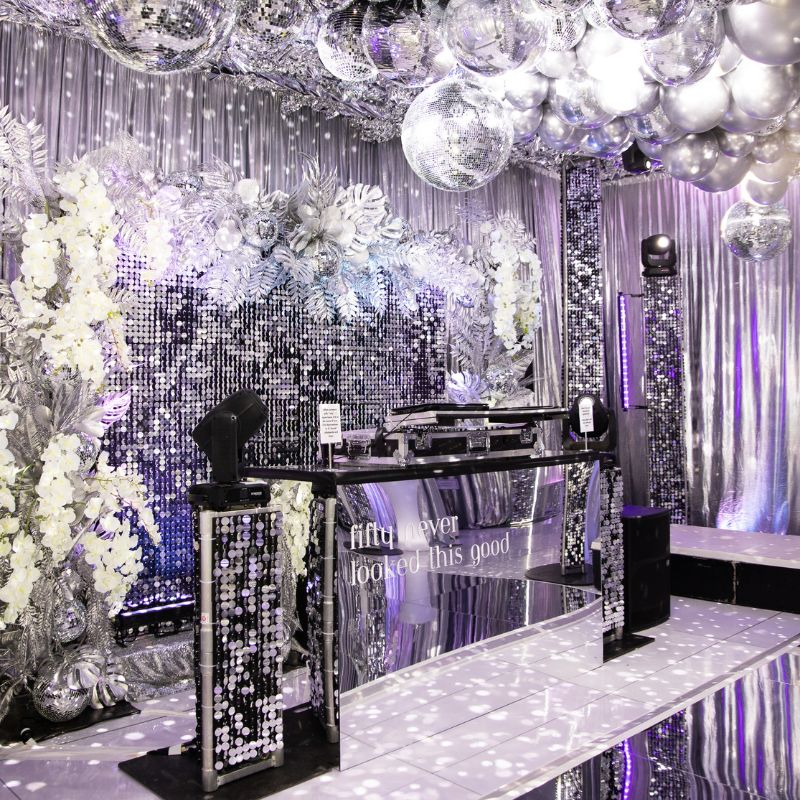 Our Silver & White décor hire includes shimmering mirror balls, silver metallic drape, silver acrylic bars and dance floor, luxe white florals, cocktail furniture, and so much more. With our selection of stunning centerpieces, stylish tableware, and modern backdrops, we help you craft an unforgettable experience with ease. Whether you're hosting an indoor gathering or an outdoor event, our team is here to provide everything you need to bring your vision to life in Melbourne.