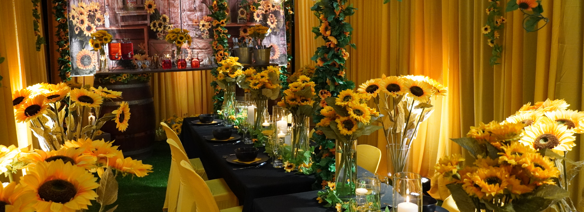Brighten up your event with a sunflower theme for your next event. Our sunflower theme decoration hire is ideal for rustic weddings, garden parties, or cheerful birthday celebrations. This setup brings warmth and colour with yellow and black draping, glowing festoon lights, and soft sunflower themed mood lighting to create a welcoming atmosphere. Style your space with sunflower theme props like giant sunflowers, decorative sunflower garlands, and sunflower themed backdrops that make for perfect photo moments.