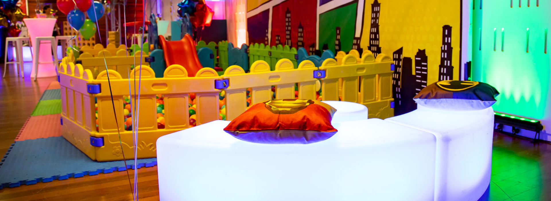 Bring comic book action to life with our super hero theme decoration hire, perfect for birthdays, corporate events, and kids' parties. Choose from a bold range of super hero theme props including superhero themed backdrops, custom superhero signage, and colourful super hero statues to create a fun, action packed space. Add glow and energy with illuminated furniture paired with our superhero cushions and custom mood lighting to match your favourite heroes’ colour schemes.