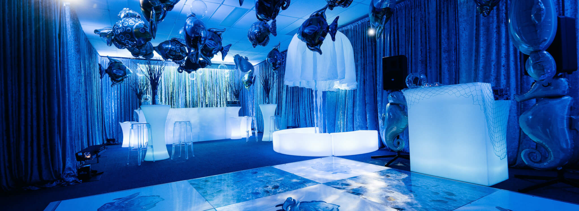 Dive into an ocean inspired party with our Under the Sea theme decoration hire, perfect for themed birthdays, school formals, or corporate parties. This theme features a range of Under the Sea theme props including inflatable jellyfish and fish, shimmering artificial seaweed, and under the sea themed backdrops to help create a fully underwater setting. Set the mood with flowing blue or teal drapes, blue mood lighting, nautical fish netting, and glowing illuminated furniture set to blue.
