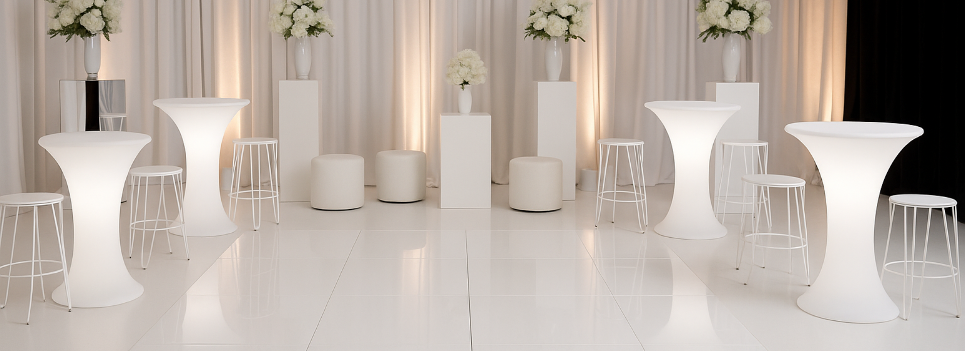 For dancing, choose between a white gloss dance floor or an illuminated white dance floor to keep the energy high. Add UV lighting to enhance every detail and let your white décor truly shine. Our full hire service across Melbourne makes it easy to style your next white party without the stress.